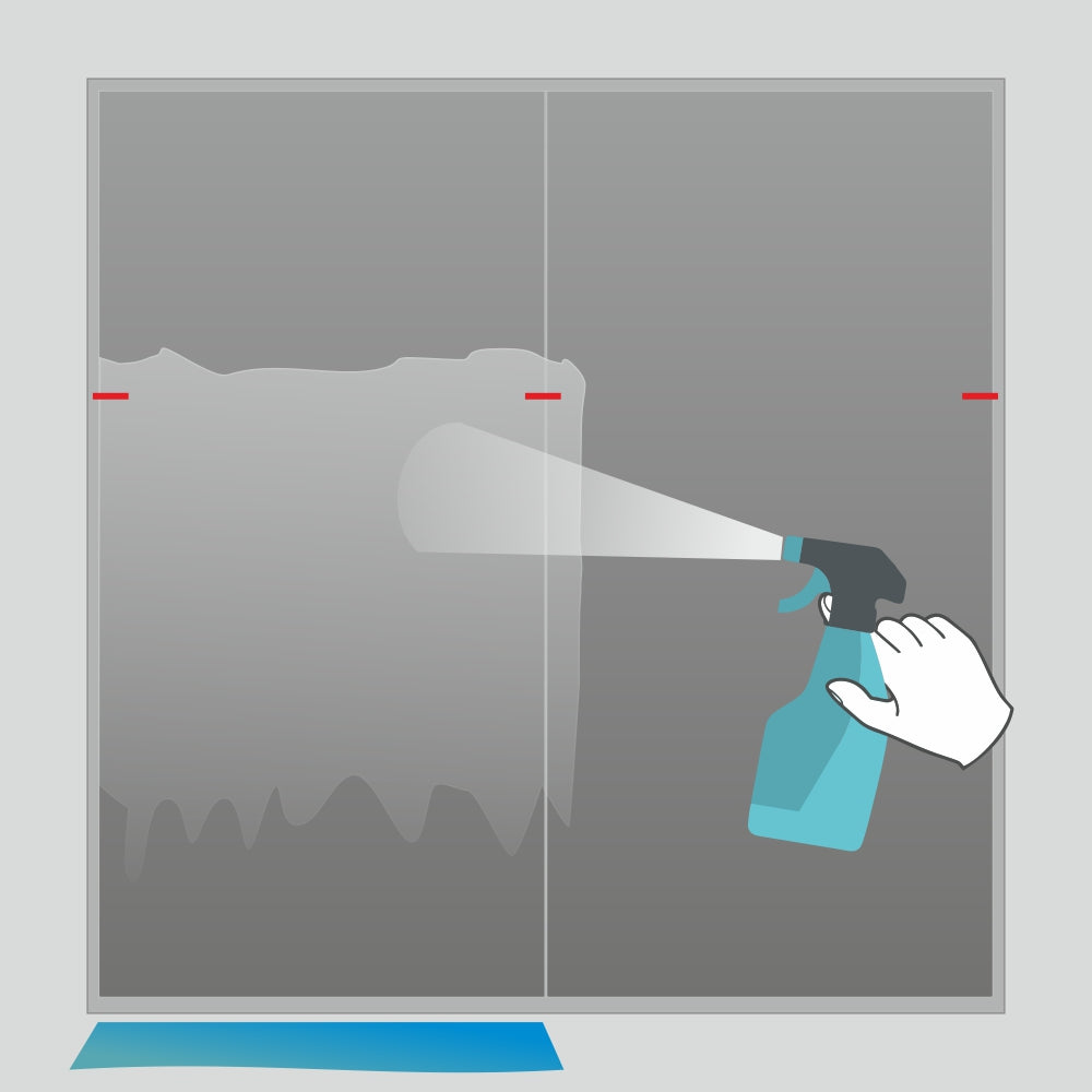 Sprühen Sie die Montageflüssigkeit gleichmäßig auf die Glasfläche, bis diese vollständig benetzt ist. Die Flüssigkeit ermöglicht ein einfaches Positionieren der Folie.