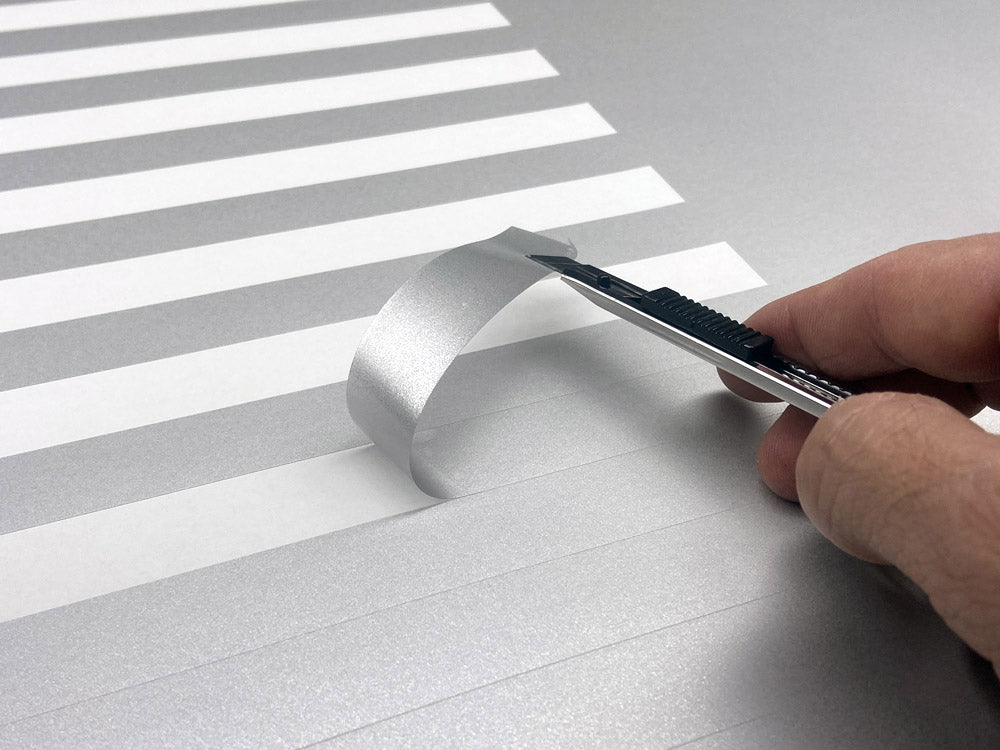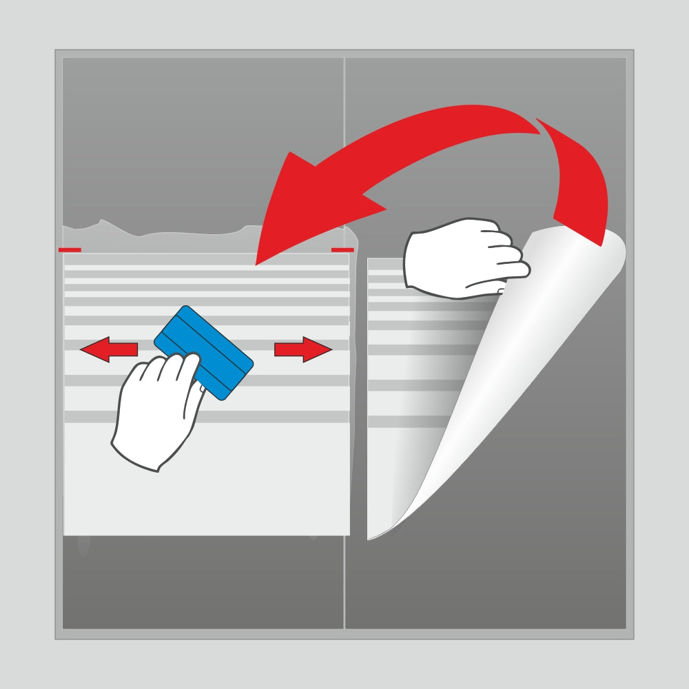 Entfernen Sie nach 24 Stunden vorsichtig das Übertragungspapier. Eventuelle Blasen können mit einem Messer angestochen und Luft oder Montageflüssigkeit herausgedrückt werden.